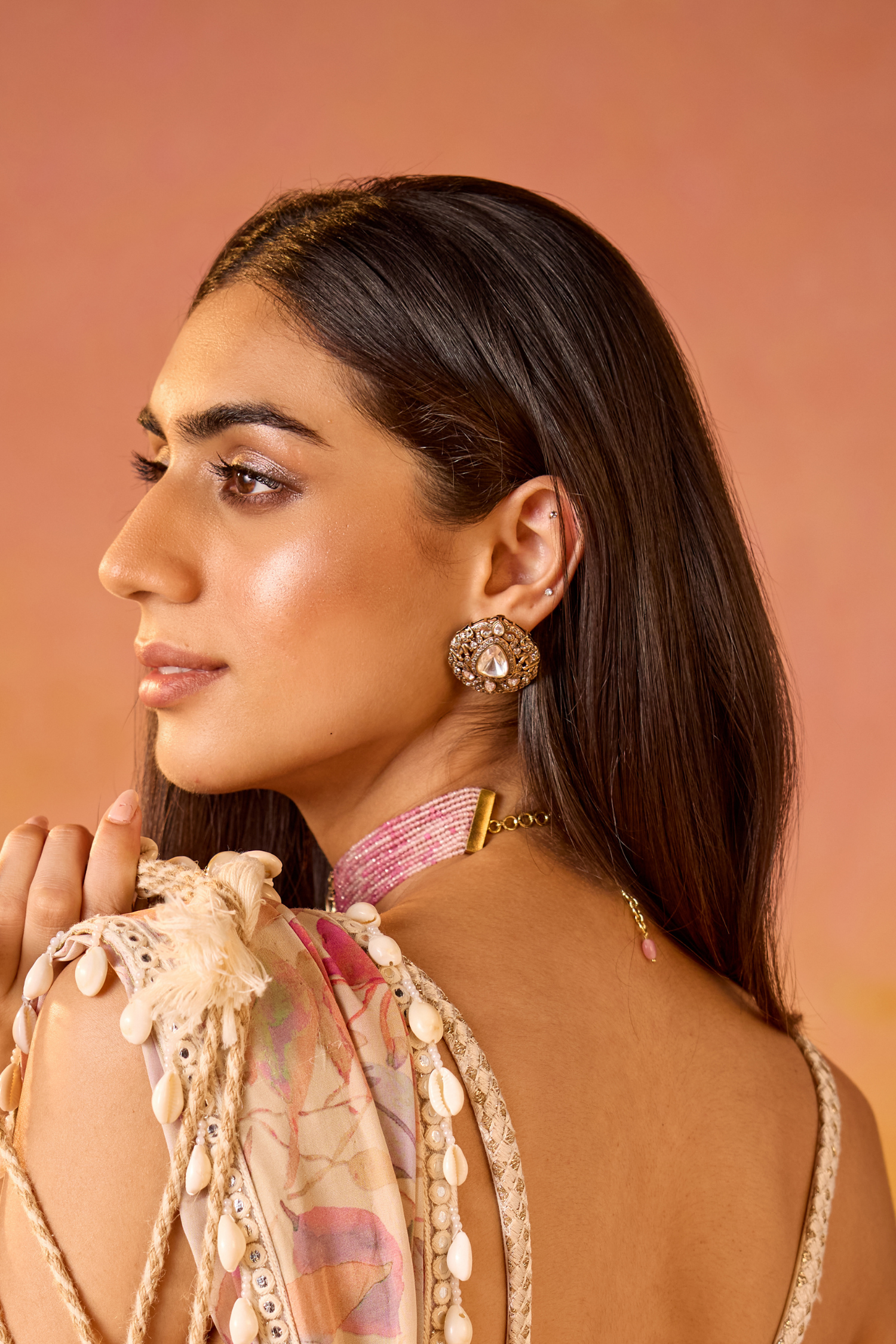 These studs showcase the ancient jadau technique, where polki pieces are hand-set within kundan-style bezels, creating that mesmerizing play of light our grandmothers called "nazar ka khel" (the dance of the gaze). The oval silhouette echoes classical Mughal jewelry proportions, while the rose-gold tone gives them contemporary versatility. When you wear these, you feel that quiet confidence that comes from connecting with centuries of Indian craftsmanship - like carrying a piece of your heritage right by your heart.