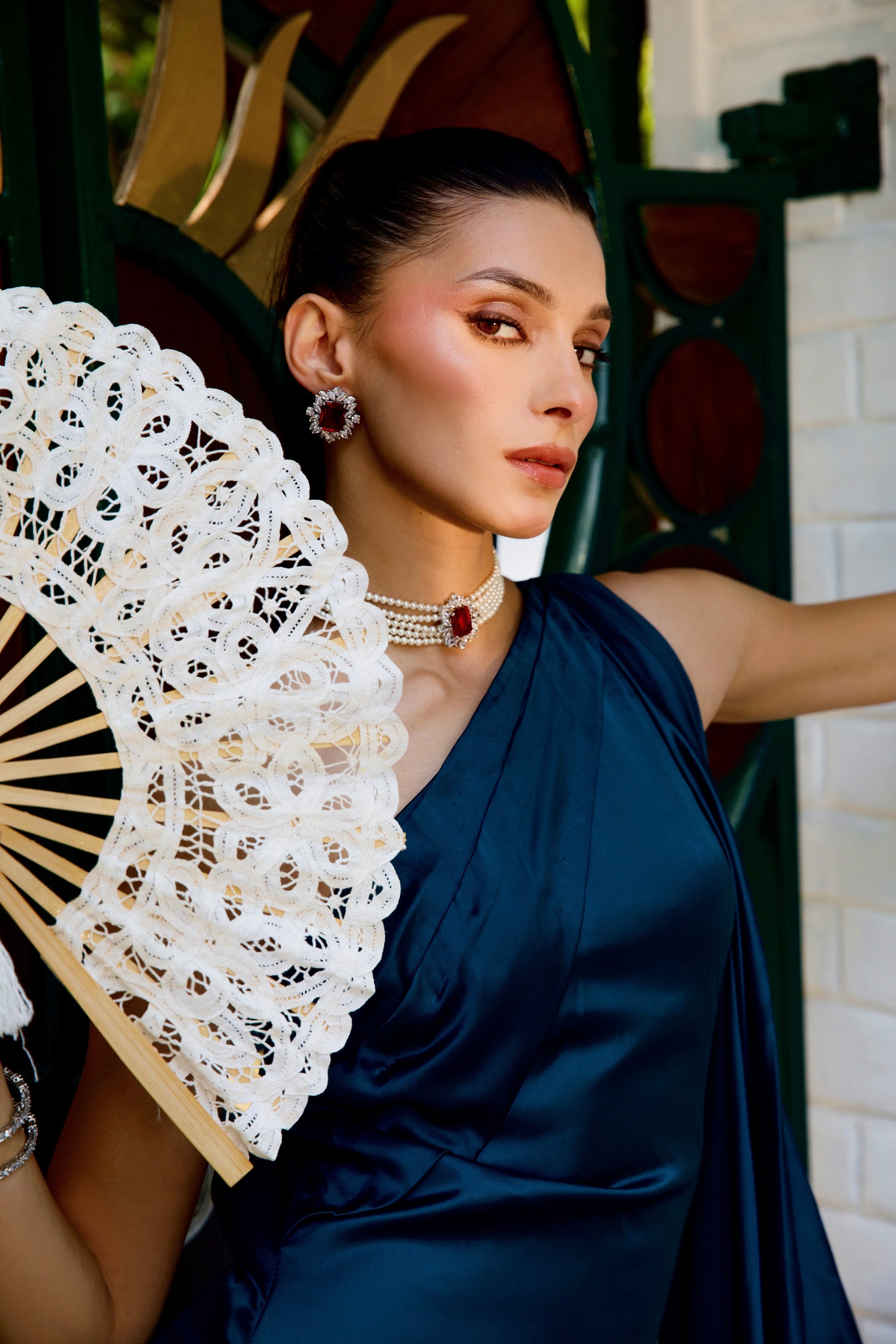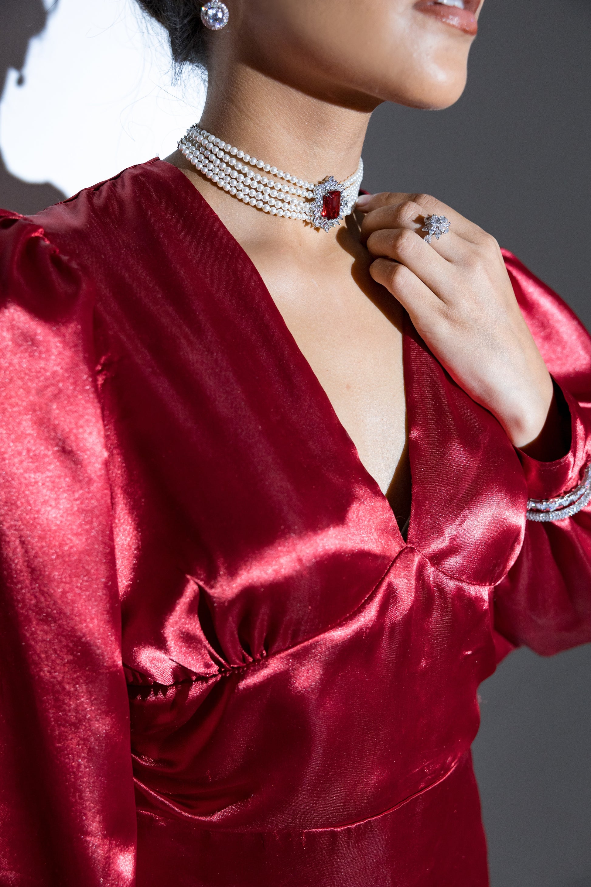 The choker necklace feels like wearing a love letter around your neck. The way the pearl strands cascade and layer creates this gentle embrace that sits perfectly at your collarbone - not too tight, but close enough that you can almost feel your heartbeat against it. The ruby-red centerpiece is what makes it special though - it's positioned right over your heart like a secret kept close. There's something deeply romantic about how the lustrous pearls catch the light differently as you move, creating this soft glow against your skin. It's the kind of piece that makes you stand a little taller, knowing you're wearing something that speaks to both strength and tenderness at once.